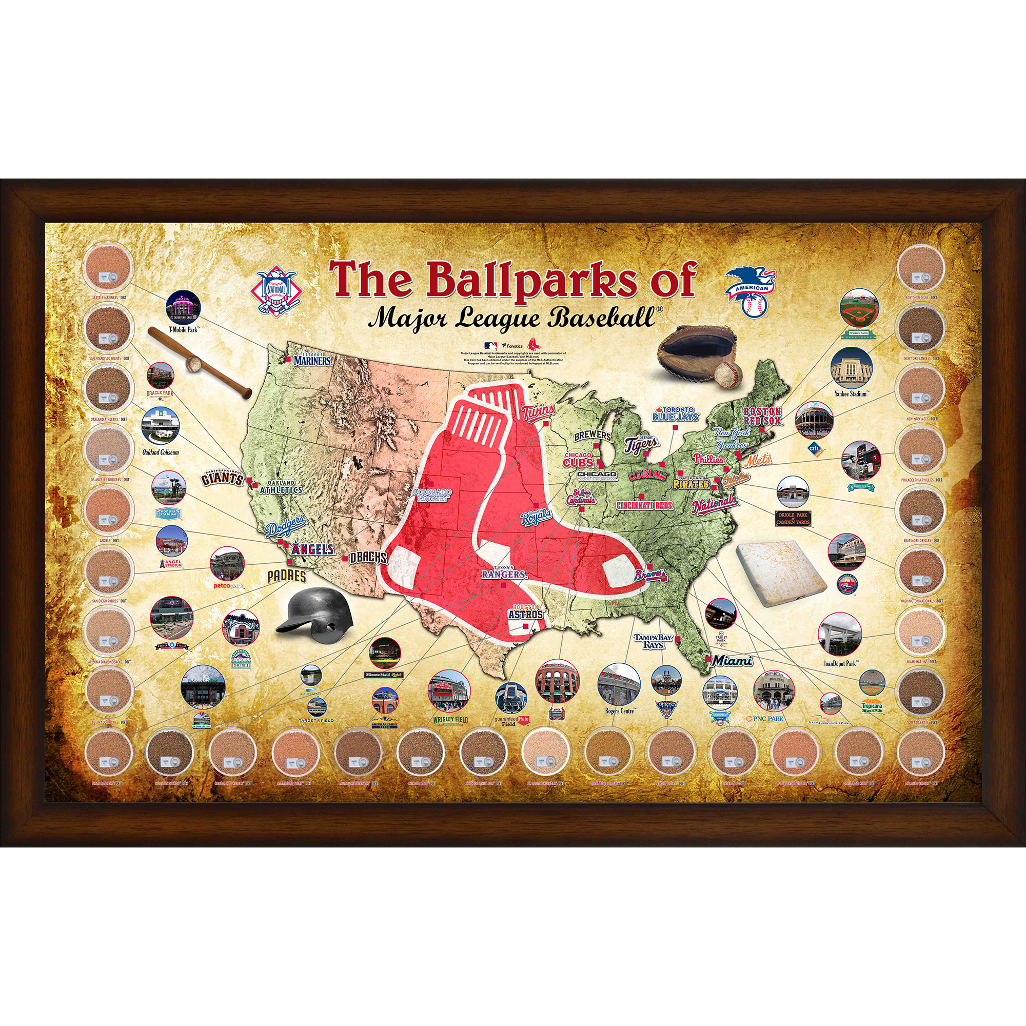 "Gerahmte MLB Parks-Kartencollage der Boston Red Sox, 20 x 32 Zoll, mit beim Spiel verwendetem Schmutz aus allen 30 Stadien"