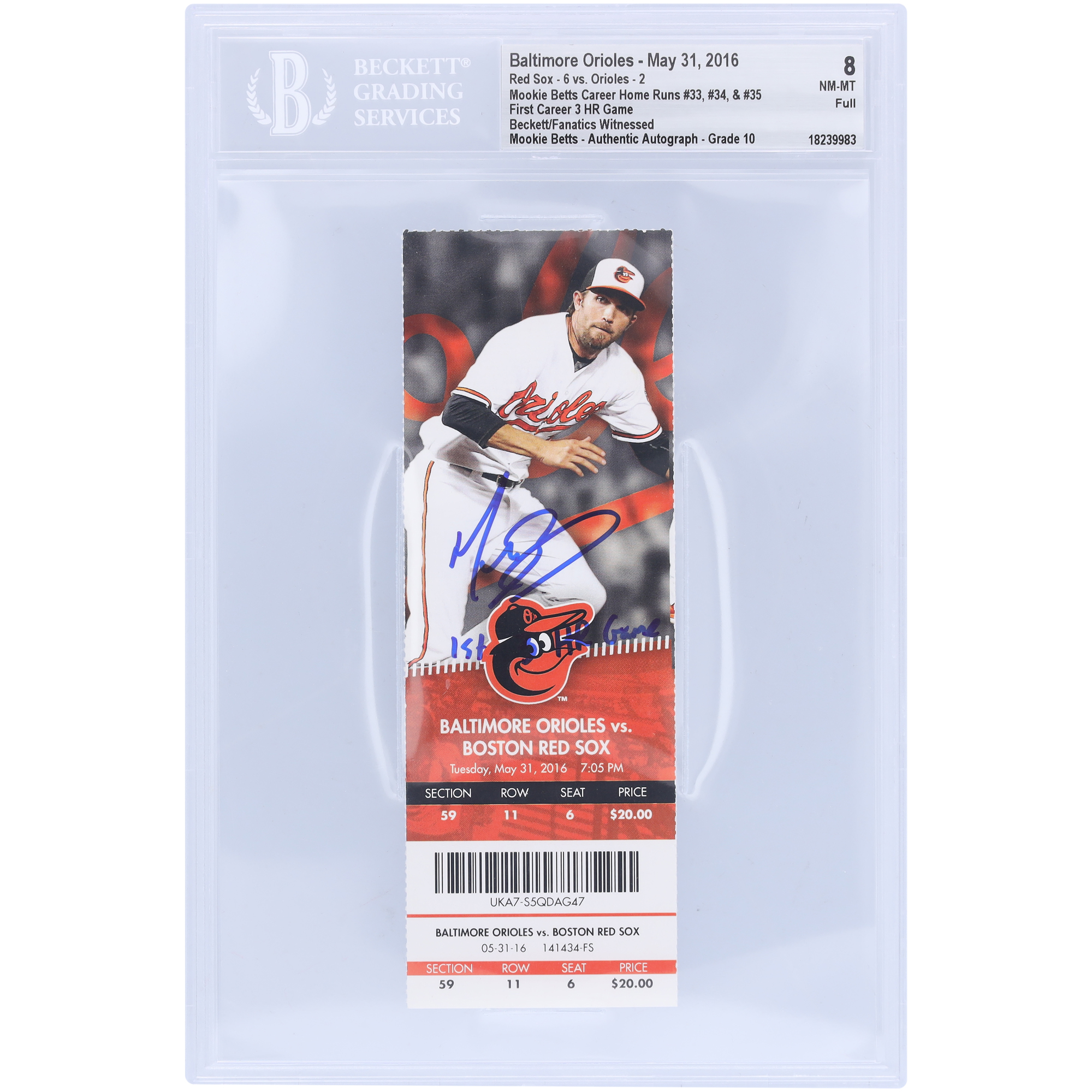"Mookie Betts, Boston Red Sox, signiertes 1. Karriere-3-HR-Spiel, Beckett-Fanatiker bezeugten authentifiziertes 8/10-Ticket vom 31. Mai 2016 mit der Aufschrift „1. 3-HR-Spiel“"